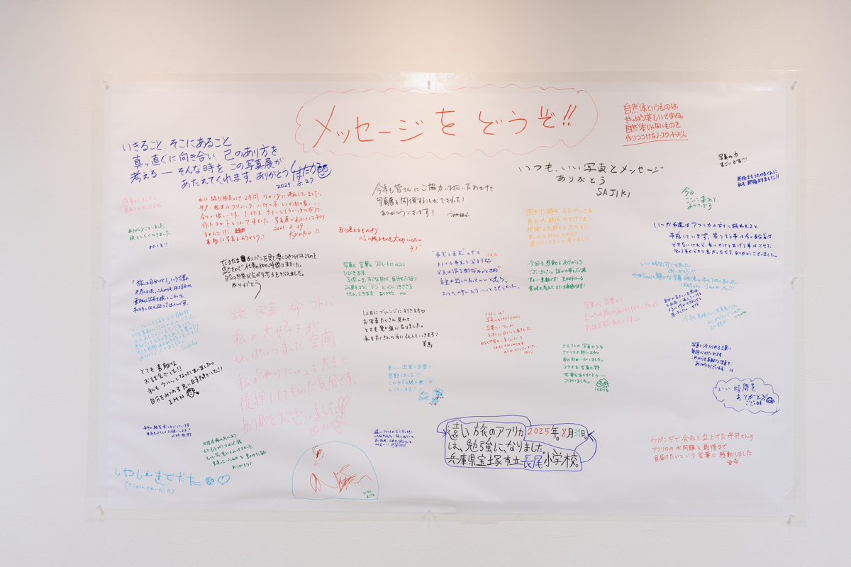 ◯8/24、ATCで用事があり、1Fのエレベータ付近の看板を見て、お邪魔させていただきました。とても良かったです。旅が好きで、以前は自転車で琵琶湖を1周したり、さざなみ街道を走ったりし、カナダは長距離バスで横断し、オーストラリアは3ヶ月のキャンプ生活をしながら、車で左半分を周りました。アフリカへはボランティアで行きたいと思っていましたが、家族から反対され、諦めました。が、写真や映像を見させていただき、また行きたい気持ちが再燃しました。